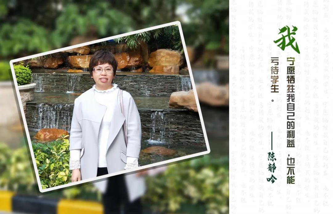為人師,從新鮮、探索到嫻熟、淡定,17年以來,陳靜吟細心呵護每一個學生,確保他們不受欺侮,確保他們擁有正確的人生觀;引導他們對自己負責,學會擔當并富有遠見;引導他們學會包容,擁有陽光的心理狀態(tài);引導他們學會感恩,學會自律;引導他們刻苦上進,學會堅持;鼓勵他們戰(zhàn)勝困難,充滿自信;尊重他們,塑造健全的人格。