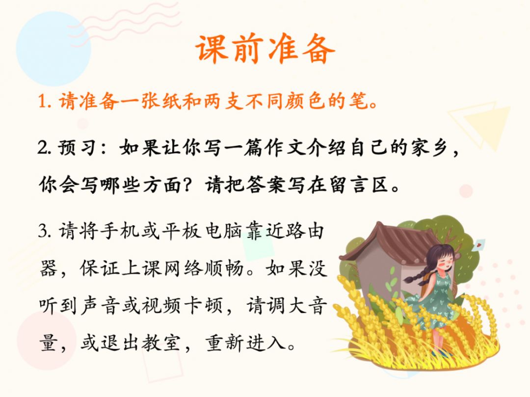 比如說這節課是下午三點開始,在2點50的時候,您就可以上線了,您可以提前10分鐘做一張PPT,把今天的預習內容,以及網絡條件怎樣才能保持通暢的注意事項發給孩子們。