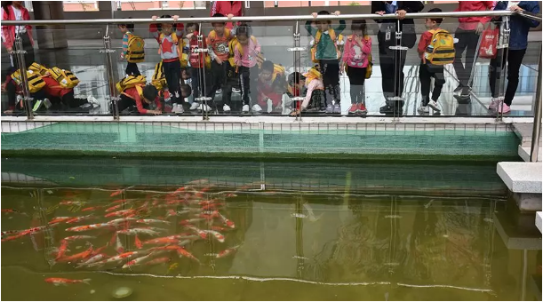 走在玻璃棧道上,孩子們膽怯又好奇,小心翼翼地走著,興致勃勃地看著,當看到玻璃下結隊的鯉魚時,孩子們激動不已,紛紛趴下來觀看。